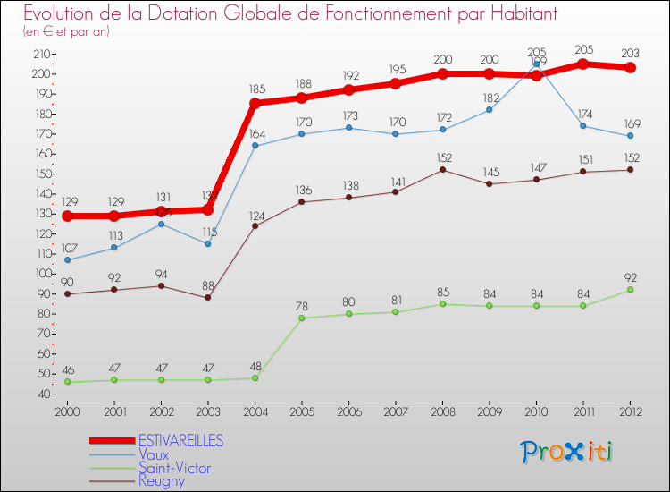 Dans le même temps, la Dotation Globale de Fonctionnement accordée aux communes françaises similaires à Estivareilles était de 214 € par habitant, en 2012.