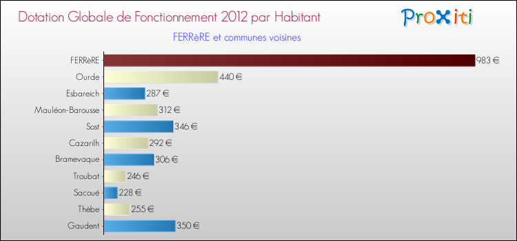 Le graphique ci dessous indique la Dotation Globale de Fonctionnement accordée par habitant à Ferrère en 2012 par rapport aux communes voisines.