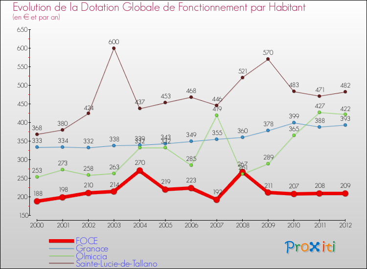 A Foce, en 2012 un habitant reçoit donc moins de subventions au titre de la DGF que pour des communes similaires.