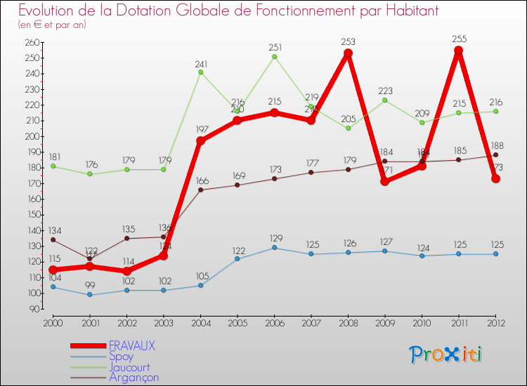 Dans le même temps, la Dotation Globale de Fonctionnement accordée aux communes françaises similaires à Fravaux était de 232 € par habitant, en 2012.