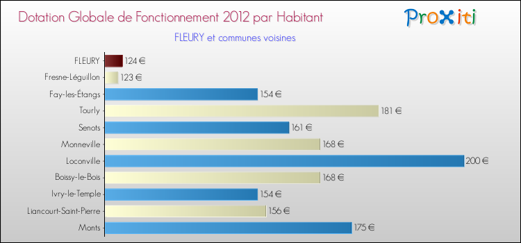 Dans le même temps, la Dotation Globale de Fonctionnement accordée aux communes françaises similaires à Fleury était de 214 € par habitant, en 2012.
