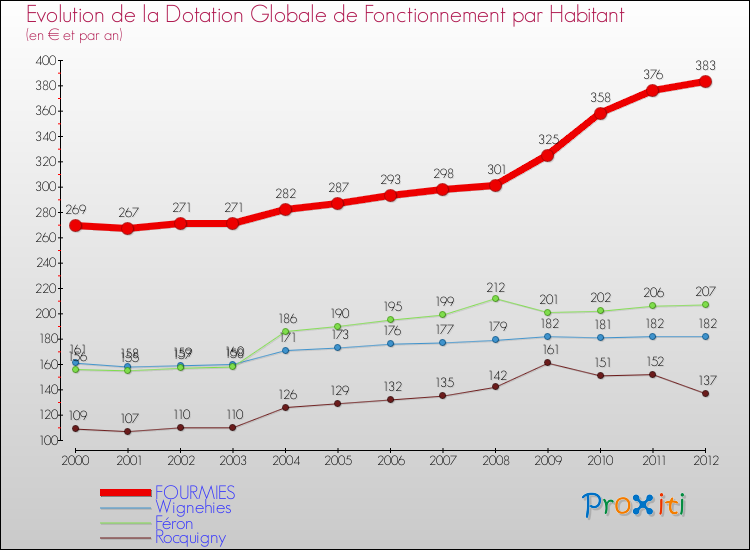 Dans le même temps, la Dotation Globale de Fonctionnement accordée aux communes françaises similaires à Fourmies était de 235 € par habitant, en 2012.