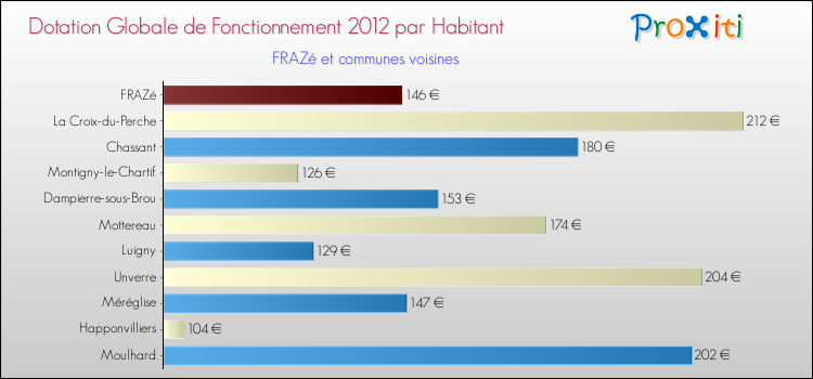 Le graphique ci dessous indique la Dotation Globale de Fonctionnement accordée par habitant à Frazé en 2012 par rapport aux communes voisines.