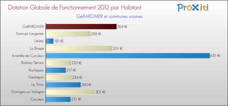 Dans le même temps, la Dotation Globale de Fonctionnement accordée aux communes françaises similaires à Gérardmer était de 286 € par habitant, en 2012.