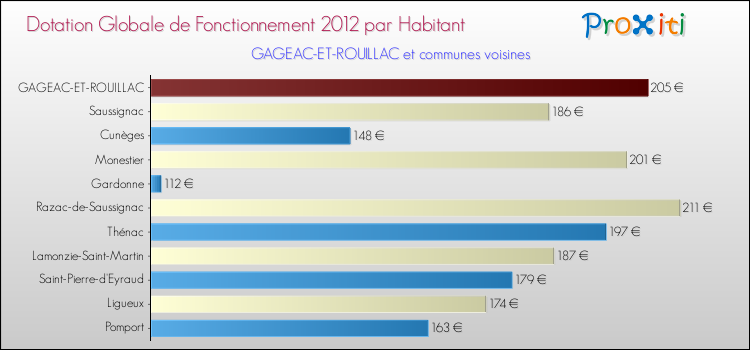 Le graphique ci dessous indique la Dotation Globale de Fonctionnement accordée par habitant à Gageac-et-Rouillac en 2012 par rapport aux communes voisines.