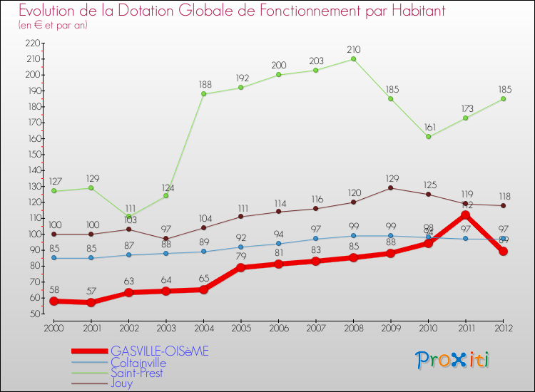 Dans le même temps, la Dotation Globale de Fonctionnement accordée aux communes françaises similaires à Gasville-Oisème était de 173 € par habitant, en 2012.