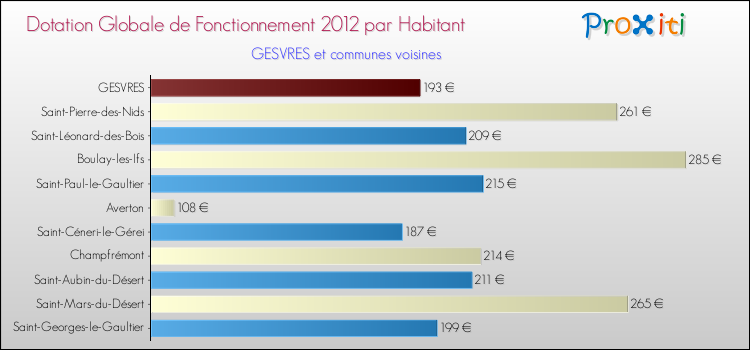 Le graphique ci dessous indique la Dotation Globale de Fonctionnement accordée par habitant à Gesvres en 2012 par rapport aux communes voisines.
