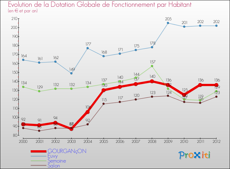 Dans le même temps, la Dotation Globale de Fonctionnement accordée aux communes françaises similaires à Gourgançon était de 232 € par habitant, en 2012.
