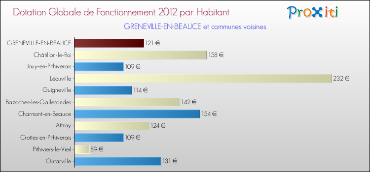 Le graphique ci dessous indique la Dotation Globale de Fonctionnement accordée par habitant à Greneville-en-Beauce en 2012 par rapport aux communes voisines.