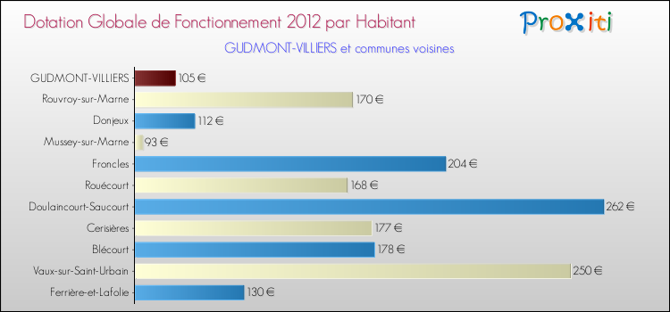 Le graphique ci dessous indique la Dotation Globale de Fonctionnement accordée par habitant à Gudmont-Villiers en 2012 par rapport aux communes voisines.