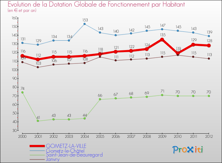 Dans le même temps, la Dotation Globale de Fonctionnement accordée aux communes françaises similaires à Gometz-la-Ville était de 173 € par habitant, en 2012.