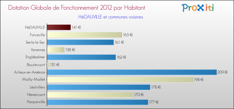 Le graphique ci dessous indique la Dotation Globale de Fonctionnement accordée par habitant à Hédauville en 2012 par rapport aux communes voisines.