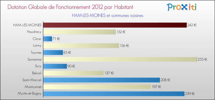Le graphique ci dessous indique la Dotation Globale de Fonctionnement accordée par habitant à Ham-les-Moines en 2012 par rapport aux communes voisines.