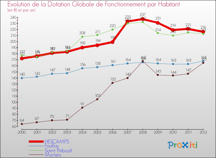 Dans le même temps, la Dotation Globale de Fonctionnement accordée aux communes françaises similaires à Hescamps était de 214 € par habitant, en 2012.