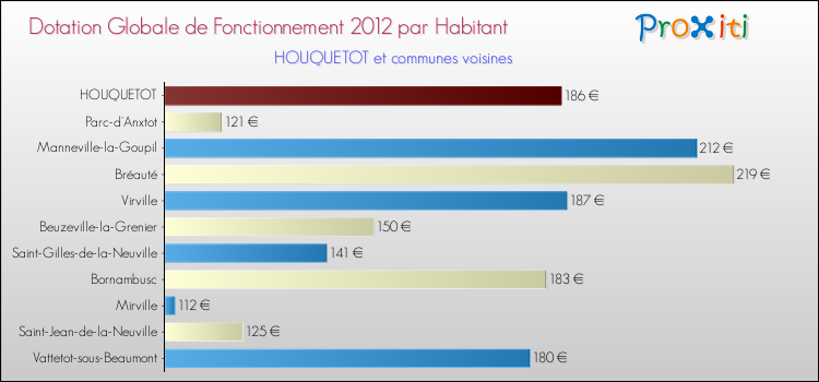 Le graphique ci dessous indique la Dotation Globale de Fonctionnement accordée par habitant à Houquetot en 2012 par rapport aux communes voisines.