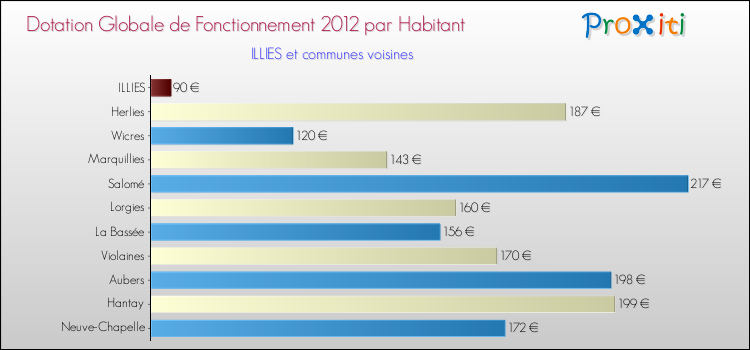 Le graphique ci dessous indique la Dotation Globale de Fonctionnement accordée par habitant à Illies en 2012 par rapport aux communes voisines.