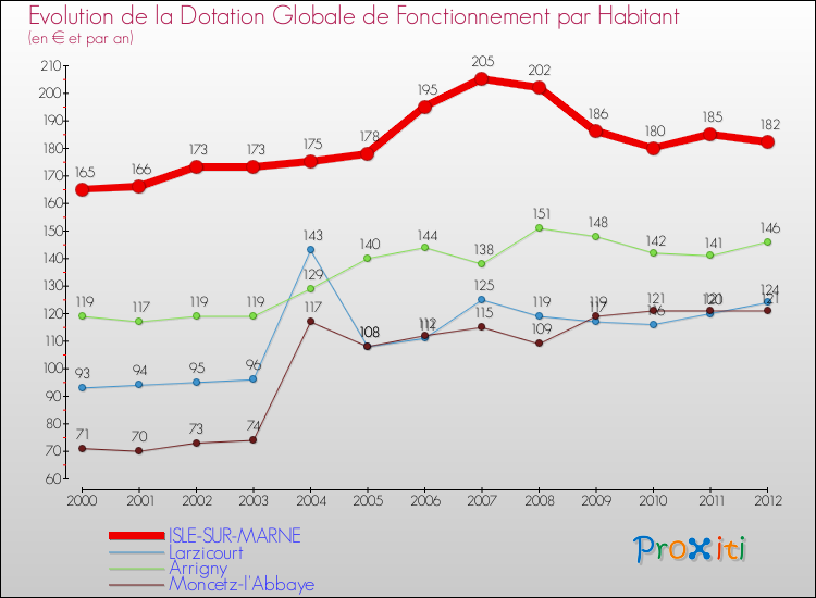Rapporté aux 114 habitants de Isle-sur-Marne en 2012, cela représente 182 € par habitant.