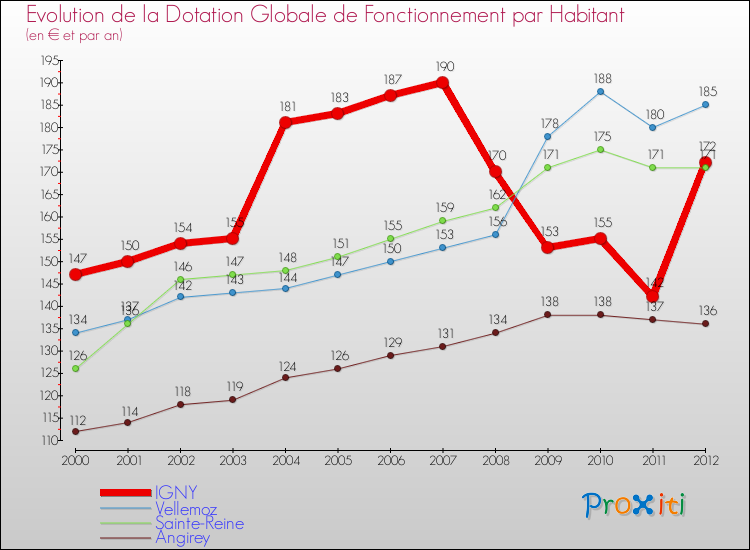 Dans le même temps, la Dotation Globale de Fonctionnement accordée aux communes françaises similaires à Igny était de 228 € par habitant, en 2012.