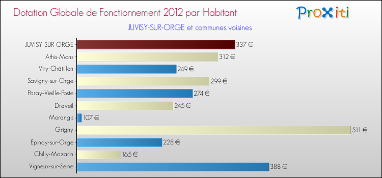 Le graphique ci dessous indique la Dotation Globale de Fonctionnement accordée par habitant à Juvisy-sur-Orge en 2012 par rapport aux communes voisines.