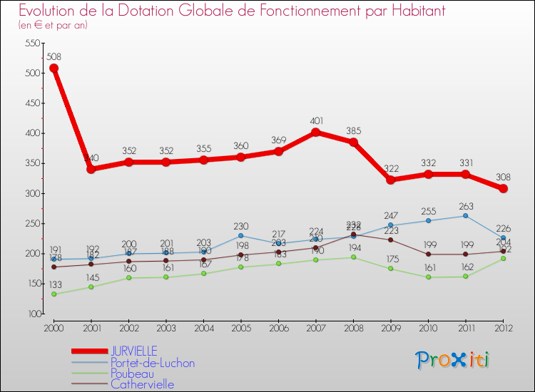 Dans le même temps, la Dotation Globale de Fonctionnement accordée aux communes françaises similaires à Jurvielle était de 232 € par habitant, en 2012.