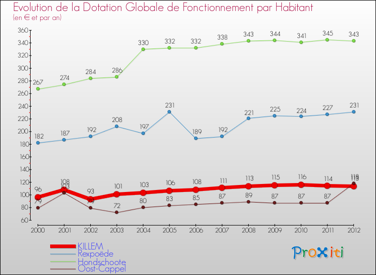 A Killem, en 2012 un habitant reçoit donc moins de subventions au titre de la DGF que pour des communes similaires.