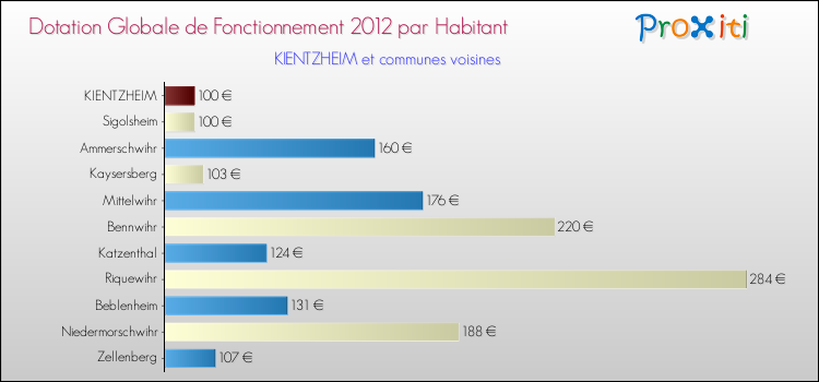 Le graphique ci dessous indique la Dotation Globale de Fonctionnement accordée par habitant à Kientzheim en 2012 par rapport aux communes voisines.