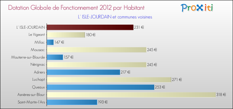 Le graphique ci dessous indique la Dotation Globale de Fonctionnement accordée par habitant à L' Isle-Jourdain en 2012 par rapport aux communes voisines.