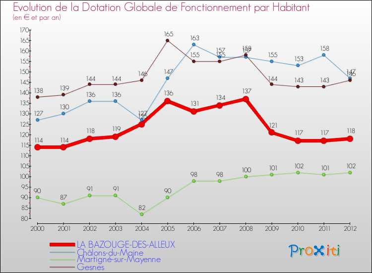 Dans le même temps, la Dotation Globale de Fonctionnement accordée aux communes françaises similaires à La Bazouge-des-Alleux était de 200 € par habitant, en 2012.
