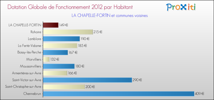 Le graphique ci dessous indique la Dotation Globale de Fonctionnement accordée par habitant à La Chapelle-Fortin en 2012 par rapport aux communes voisines.