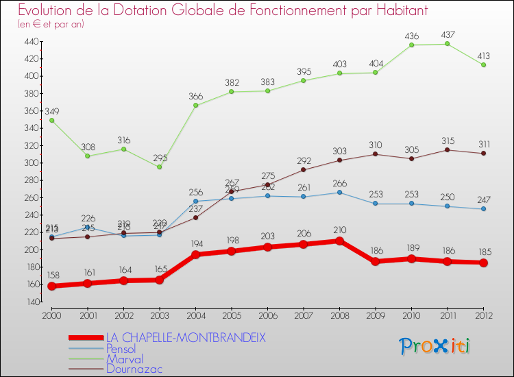 Dans le même temps, la Dotation Globale de Fonctionnement accordée aux communes françaises similaires à La Chapelle-Montbrandeix était de 181 € par habitant, en 2012.
