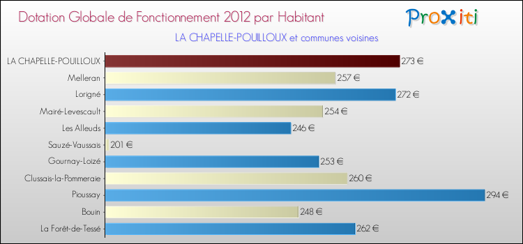 Le graphique ci dessous indique la Dotation Globale de Fonctionnement accordée par habitant à La Chapelle-Pouilloux en 2012 par rapport aux communes voisines.