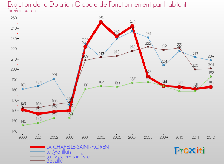 Dans le même temps, la Dotation Globale de Fonctionnement accordée aux communes françaises similaires à La Chapelle-Saint-Florent était de 173 € par habitant, en 2012.