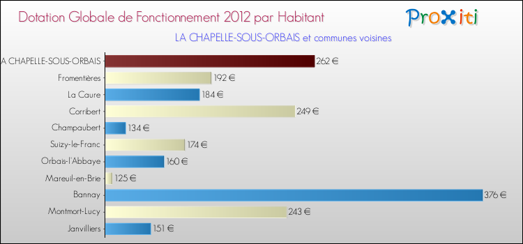 Le graphique ci dessous indique la Dotation Globale de Fonctionnement accordée par habitant à La Chapelle-sous-Orbais en 2012 par rapport aux communes voisines.