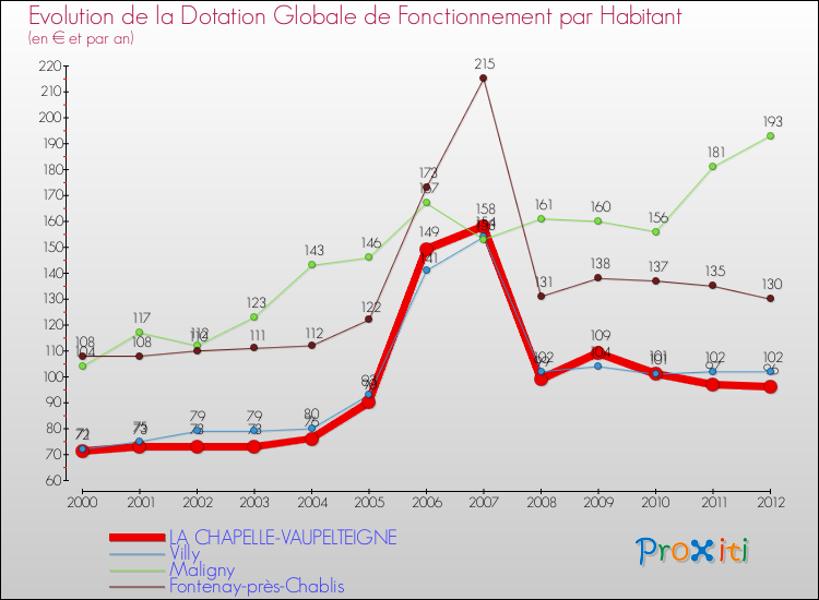 Dans le même temps, la Dotation Globale de Fonctionnement accordée aux communes françaises similaires à La Chapelle-Vaupelteigne était de 232 € par habitant, en 2012.