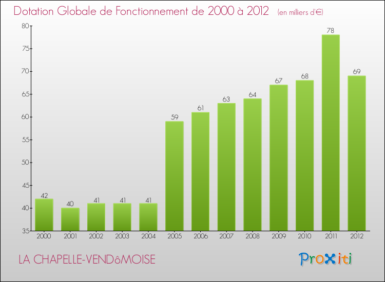 En effet, la dotation globale de fonctionnement versée par l'état en 2012 à la seule commune de La Chapelle-Vendômoise était de : 69 000 € au total.