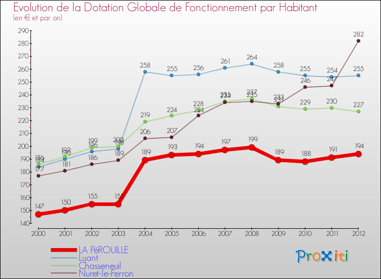 Dans le même temps, la Dotation Globale de Fonctionnement accordée aux communes françaises similaires à La Pérouille était de 200 € par habitant, en 2012.