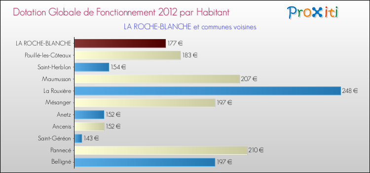 Dans le même temps, la Dotation Globale de Fonctionnement accordée aux communes françaises similaires à La Roche-Blanche était de 173 € par habitant, en 2012.