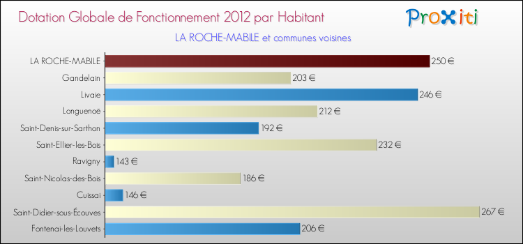 Le graphique ci dessous indique la Dotation Globale de Fonctionnement accordée par habitant à La Roche-Mabile en 2012 par rapport aux communes voisines.