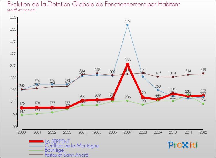 Le graphique ci dessous indique la Dotation Globale de Fonctionnement accordée par habitant à La Serpent en 2012 par rapport aux communes voisines.