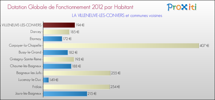 Le graphique ci dessous indique la Dotation Globale de Fonctionnement accordée par habitant à La Villeneuve-les-Convers en 2012 par rapport aux communes voisines.