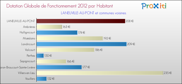 Le graphique ci dessous indique la Dotation Globale de Fonctionnement accordée par habitant à Laneuville-au-Pont en 2012 par rapport aux communes voisines.