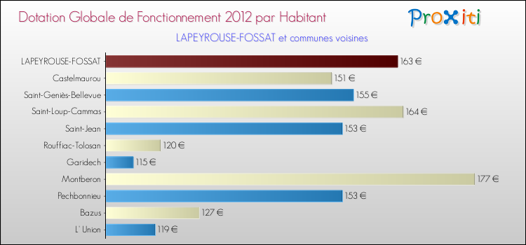 Le graphique ci dessous indique la Dotation Globale de Fonctionnement accordée par habitant à Lapeyrouse-Fossat en 2012 par rapport aux communes voisines.