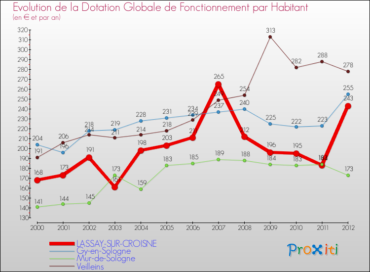 Le graphique ci dessous indique la Dotation Globale de Fonctionnement accordée par habitant à Lassay-sur-Croisne en 2012 par rapport aux communes voisines.