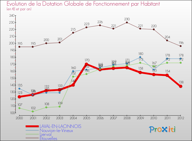 Dans le même temps, la Dotation Globale de Fonctionnement accordée aux communes françaises similaires à Laval-en-Laonnois était de 200 € par habitant, en 2012.