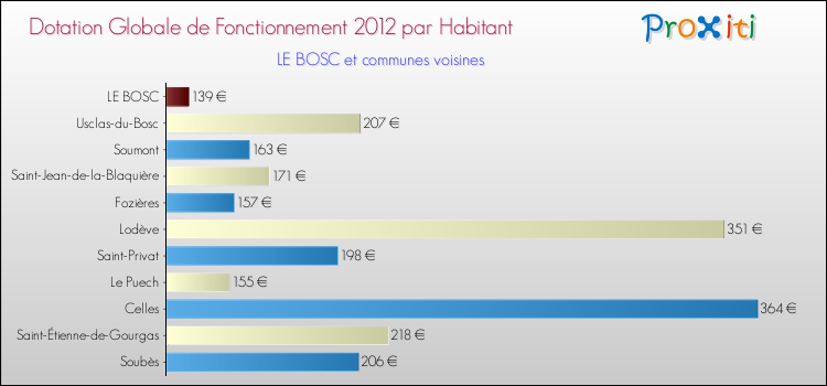 Le graphique ci dessous indique la Dotation Globale de Fonctionnement accordée par habitant à Le Bosc en 2012 par rapport aux communes voisines.