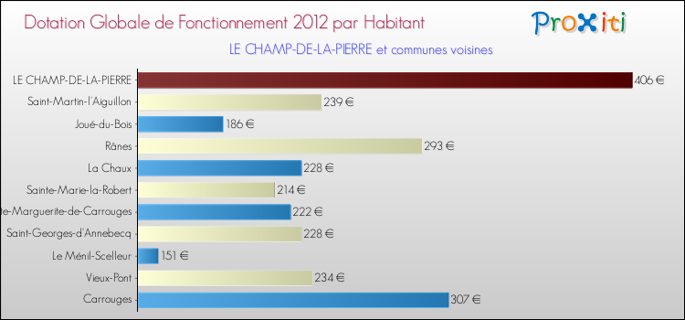 Le graphique ci dessous indique la Dotation Globale de Fonctionnement accordée par habitant à Le Champ-de-la-Pierre en 2012 par rapport aux communes voisines.