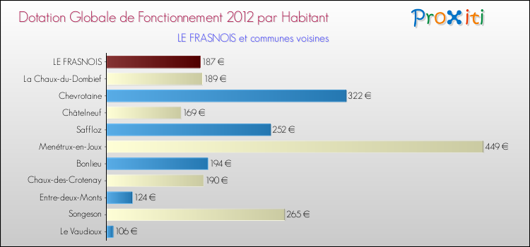 Le graphique ci dessous indique la Dotation Globale de Fonctionnement accordée par habitant à Le Frasnois en 2012 par rapport aux communes voisines.