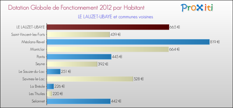 Le graphique ci dessous indique la Dotation Globale de Fonctionnement accordée par habitant à Le Lauzet-Ubaye en 2012 par rapport aux communes voisines.