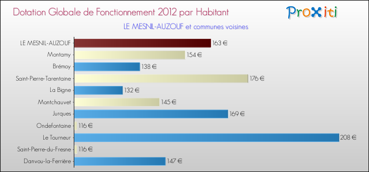Le graphique ci dessous indique la Dotation Globale de Fonctionnement accordée par habitant à Le Mesnil-Auzouf en 2012 par rapport aux communes voisines.