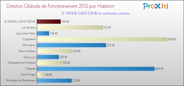 Le graphique ci dessous indique la Dotation Globale de Fonctionnement accordée par habitant à Le Mesnil-Saint-Denis en 2012 par rapport aux communes voisines.